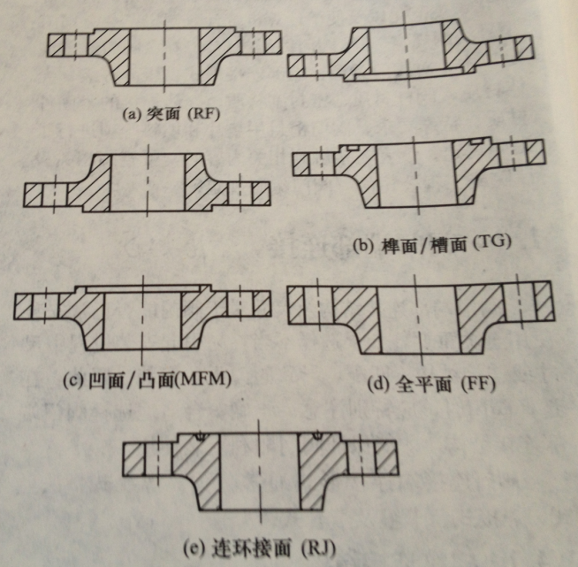 全平面法蘭一般用于低壓鑄鐵、鑄鋼或非金屬閥門中。突面法蘭在中低壓情況下能達(dá)到很好的密封效果,故在客戶無特殊要求時中低壓閥門大多采用突面法蘭。榫槽式法蘭是將平墊片安裝在封閉槽中,這種結(jié)構(gòu)在密封面上,可產(chǎn)生很高的密封比壓,通常遠(yuǎn)遠(yuǎn)超過墊片材料的屈服點,從而保證了可靠的密封性。其缺點是長期使用后,閥門部件維修或更換時,墊片難以從密封槽中取出,如果硬性取出,往往會將密封槽損壞,所以這種法蘭并不是廣泛使用的法蘭類型,它的用途也很有限。凹凸式法蘭是將平墊片安裝在凹面法蘭的密封面內(nèi),與榫槽式密封結(jié)構(gòu)相比,其易于拆卸,其缺點是墊片容易與介質(zhì)接觸,使用在高壓下易被介質(zhì)沖刷、變形,無法起到良好的密封效果,設(shè)計、制造時可根據(jù)實際需要適當(dāng)?shù)丶尤雰?nèi)、外環(huán)、及內(nèi)、外包邊,以提高其密封效果。環(huán)連接面法蘭是在兩個帶有環(huán)型凹槽的突面法蘭中放入一個環(huán)型軟技術(shù)環(huán)墊片,墊片會有輕微的變形以起到密封作用,它廣泛用于高壓和有毒流體管道。常用法蘭密封面類型及代號如圖1-8所示。