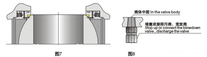 閥門(mén)處于關(guān)閉狀態(tài)時(shí)(圖7),上下游側(cè)的閥座使流體阻斷.固定式球閥的閥體中腔的積滯韌可以排泄,排泄裝置(圖8)有如下功能:
