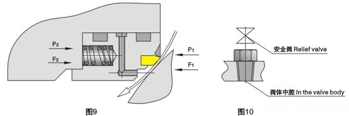 球閥中腔停滯的介質(zhì)由于溫度升高,而出現(xiàn)異常升壓時(shí),閥座脫離球體自動(dòng)泄壓(圖9)或閥體上安裝的安全閥(圖10)保證系統(tǒng)安全。