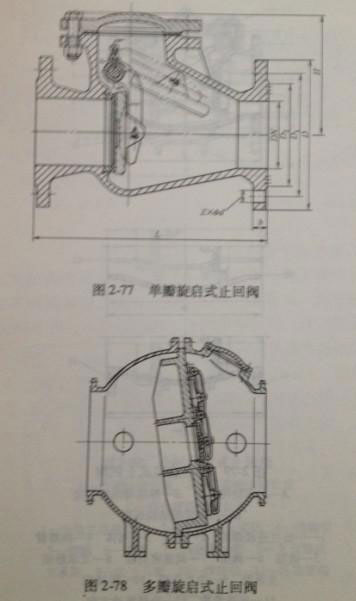 旋啟式止回閥的閥瓣圍繞閥座外的銷軸旋轉(zhuǎn),開(kāi)啟或關(guān)閉止回閥。旋啟式止回閥分閥瓣為一個(gè)的單瓣式止回閥與閥瓣為多個(gè)的多瓣式止回閥;又有縮徑旋啟式止回閥與全徑旋啟式止回閥之分。單閥瓣旋啟式止回閥的機(jī)構(gòu)如圖2-77所以,一般用于公稱尺寸DN50~DN500;多閥瓣旋啟式止回閥的機(jī)構(gòu)如圖2-78所示,一般用于公稱尺寸大小等于DN600。