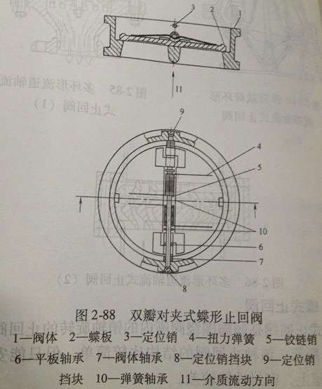 近來(lái)又開(kāi)發(fā)一種雙板蝶形止回閥,機(jī)構(gòu)如圖2-88所示。兩半圓形蝶板用銷軸固定在閥體中,銷軸上有兩個(gè)扭力彈簧,把碟板安裝于閥體密封面上,靠介質(zhì)壓力推開(kāi)彈簧壓緊的碟板,反向流動(dòng)時(shí),靠彈簧力和介質(zhì)壓力關(guān)閉閥門(mén)。該種蝶形止回閥多為對(duì)夾機(jī)構(gòu),體積小,重量輕,密封可靠,可安裝于水平管道和垂直管道中。