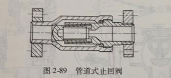 管道式止回閥是閥瓣沿著筒狀閥體軸線滑動(dòng)的止回閥,如圖2-89所示。這種止回閥的體積較小,重量較輕,加工工藝性好,但流體阻力系數(shù)比旋啟式止回閥略大,可安裝于水平管路和垂直管路中。