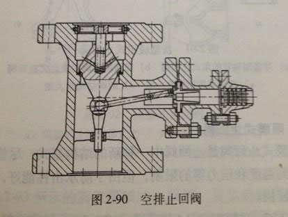 空排止回閥是一種特殊用途的止回閥,用于鍋爐給水泵的出口,以防止介質(zhì)倒流及空排作用,其結(jié)構(gòu)形式如圖2-90所示。