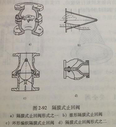 圖2-92a是隔膜式止回閥的機(jī)構(gòu)形式之一。這種機(jī)構(gòu)適用于各種不同流量與流速系統(tǒng),水擊壓力比傳統(tǒng)的旋啟式止回閥小得多。圖2-92b是錐形隔膜式止回閥。這種閥門(mén)的安裝是對(duì)夾在兩管道法蘭之間。該閥關(guān)閉速度極為迅速。圖2-92c是環(huán)形編織隔膜式止回閥。這種止回閥采用了皺的環(huán)狀橡膠隔膜,關(guān)閉速度極快,但其使用范圍通常受壓差(△p<1.0mpa)he 溫度(t≤80℃)的限制。圖2-92d是隔膜止回閥形式之二,其關(guān)閉件是一個(gè)一端為扁平形的彈簧套,當(dāng)介質(zhì)倒流時(shí),套管的扁平端閉合,起到止回的作用。