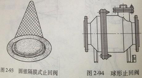 圖2-93所示的圓錐隔膜式止回閥,其主要部件是一個(gè)多孔不銹鋼圓錐套和一個(gè)橡膠隔膜。這種止回閥沒(méi)有金屬運(yùn)動(dòng)構(gòu)件,質(zhì)量很輕,并且可以水平或垂直安裝在管路上,其至可以豎直地向上流動(dòng)。但是,這種止回閥的工作溫度和工作壓力受隔膜材料的限制,只能用在低壓和溫度低于150℃的場(chǎng)合。