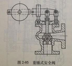 1.重錘式安全閥:用杠桿靜和重錘來平衡閥瓣的壓力,如圖2-95所示。這種機(jī)構(gòu)的優(yōu)點(diǎn)在于由閥桿傳來的力基力上是不變的。其缺點(diǎn)是較為笨重,關(guān)閉壓力低。這種機(jī)構(gòu)只能在固定設(shè)備上,其重錘的重量一般不應(yīng)=超過60kg,以免操作困難。