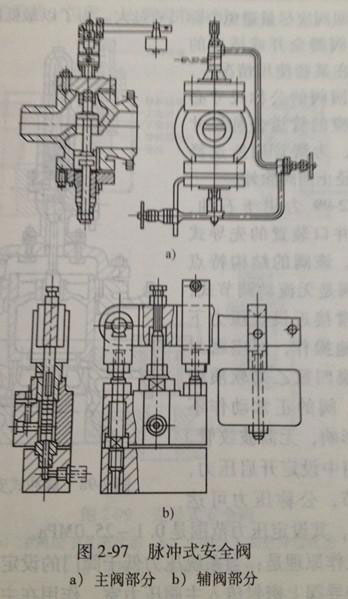 3.脈沖式安全閥:脈沖式安全閥又稱先導(dǎo)式安全閥。它把主閥和輔閥設(shè)計(jì)在一起,通過輔閥的脈沖作用帶動(dòng)主閥動(dòng)作,這種機(jī)構(gòu)通常用于大口徑、大排量及高壓系統(tǒng)。脈沖式安全閥如圖2-97所示,其a為主閥部分,圖b為輔閥部分。