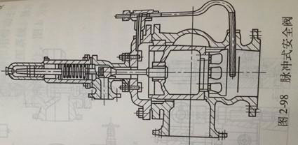 圖2-98為大直徑輸水管路上用的脈沖式安全閥。它也是主閥和輔閥組成,輔閥為口徑很小的直接載荷式安全閥,它與主閥相連接。當(dāng)系統(tǒng)超壓時(shí),輔閥首先開啟,排放介質(zhì),從而驅(qū)動(dòng)或控制主閥瓣開啟,大量排放介質(zhì)。