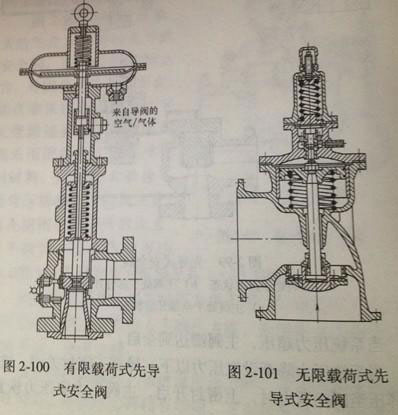 圖2-100所示為有限載荷先導(dǎo)式安全閥,加于主閥瓣的關(guān)閉載荷由彈簧提供,其大小是受到限制的,即使先導(dǎo)閥未能起作用,主閥也能在允許超壓的范圍開啟。其缺點(diǎn)是主閥的密封性不如無限載荷式好。
