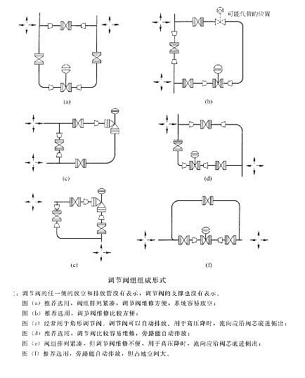 調節(jié)閥的安裝通常情況下有一個調節(jié)閥組,即上游閥、旁路閥、下游閥和調節(jié)閥。圖8-3給出了調節(jié)閥常用的六種組合形式,并對各自的特點進行說明。