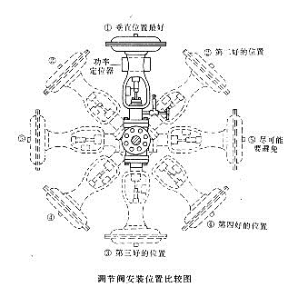 通常調節(jié)閥要求垂直安裝。在滿足不了垂直安裝時,對法蘭用4個螺栓固定的調節(jié)閥可以有向上傾斜45°、向下傾斜45°、水平安裝和向下垂直安裝四個位置。對法蘭用8個螺栓固定的調節(jié)閥則可以有9個安裝位置,分別相隔22.5°。